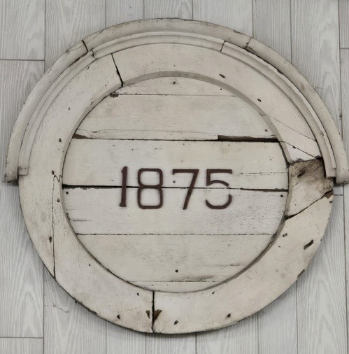 This circle plate hangs in our Fellowship hall today. It is from the front of the original church building. You can see it in the picture above.