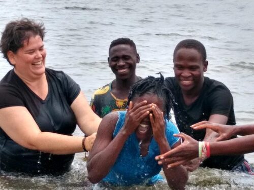 Pastor Carmen doing a baptism on a mission trip to Uganda.